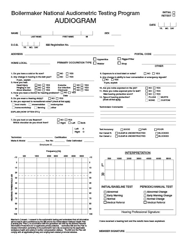 Ensure the clinic or testing provider have a blank copy of the IBB audiogram to be completed. If they don’t or you’re unsure, you can find an electronic copy here. Once your hearing test is completed, you can email an electronic copy (document or photo) of your completed audiogram to the national database at medical@boilermakersbenefits.ca. Additionally, proof of testing will be uploaded to your mobile Boilermaker app profile. Note: no confidential medical information will be available through the mobile Boilermaker app. You are also entitled to a personal copy of your audiogram for your personal records.